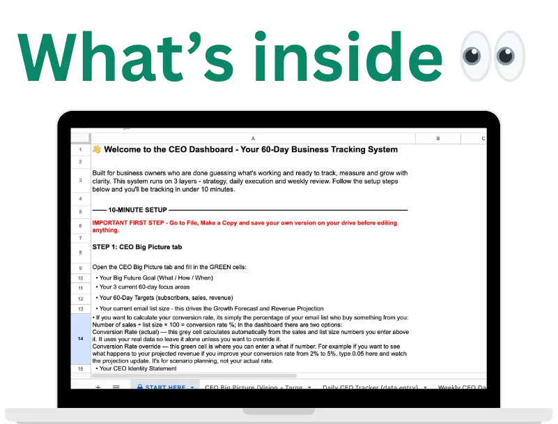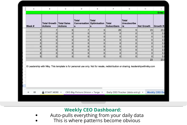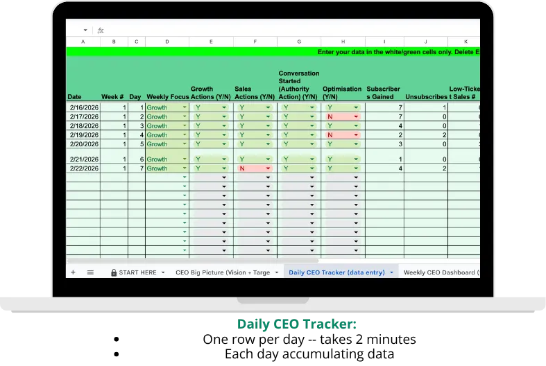 ✅ Daily CEO Tracker - One row per day. Log your growth actions, sales actions, conversations, subscribers gained, unsubscribes, revenue and daily score. Takes 2 minutes. Builds the data that shows you what's actually working.