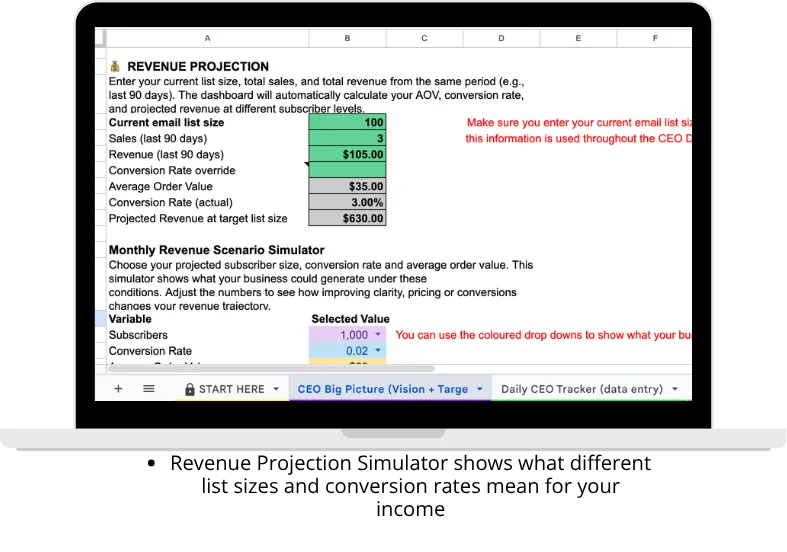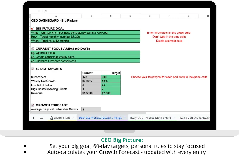 ✅ CEO Big Picture - Set your big goal, 60-day targets, revenue projection and growth forecast. Your numbers update automatically as you track daily. Includes a Monthly Revenue Scenario Simulator so you can see what different subscriber counts, conversion rates and price points actually mean for your income.
