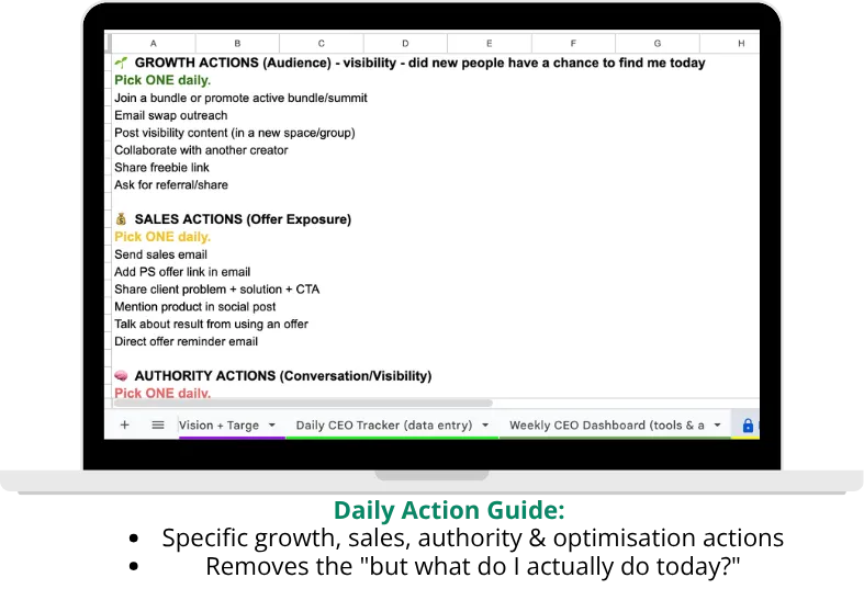 ✅ Daily Action Guide - Your daily menu of growth, sales, authority and optimisation actions. Pick one from each category and you've done the right work for the day.