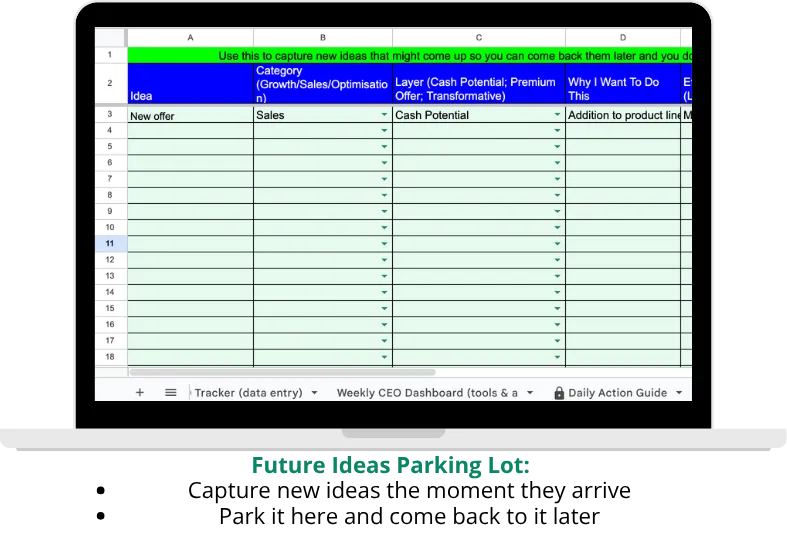 ✅ Future Ideas Parking Lot - Capture new ideas without letting them derail your 60-day focus. Thats CEO thinking.