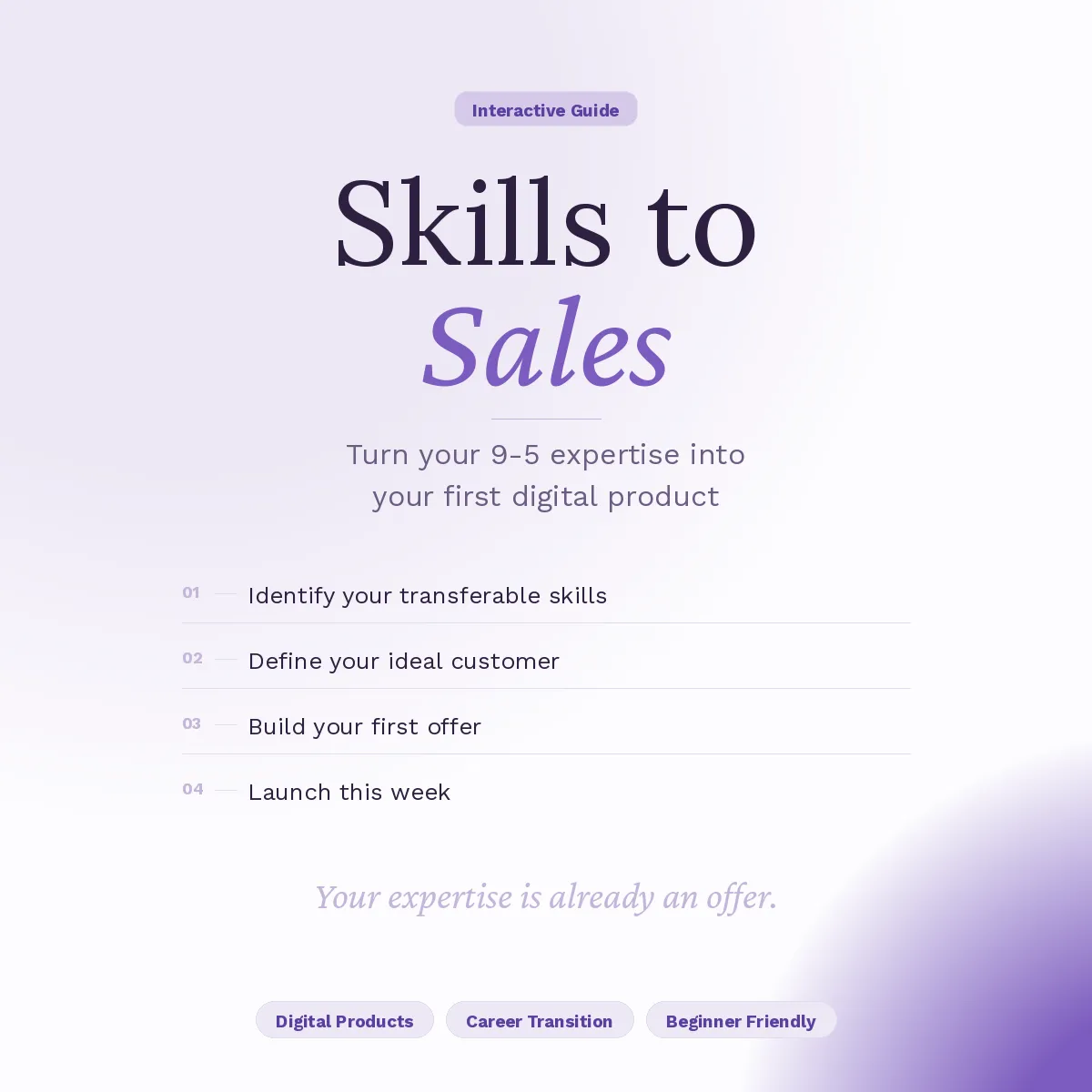You already have everything you need to build your first digital product — you just haven't packaged it yet. Skills to Sales is a personalized interactive guide that takes your existing career expertise and turns it into a concrete product idea, complete with a full outline and launch plan. In 5 steps, walk away knowing exactly what to sell, who to sell it to, and how to start this week.